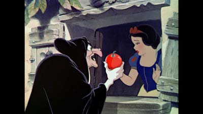 Mal sabiam eles que a rainha já sabia que tinha sido enganada pelo caçador e que Branca de Neve estava morando com os anões, se transformando numa velha mendiga, ela envenena uma maça, para que a bela princesa ao morde-la caísse num sono eterno. No dia seguinte ao da chegada de Branca de Neve na casa dos anões, eles se despedem da jovem princesa e voltam para mais um dia de trabalho na mina, enquanto isso a rainha, transformada em uma velha mendiga, encontra Branca de Neve e a faz dar uma mordida na maçã envenenada, fazendo com que a jovem cai ao chão, desfalecendo, como se estivesse morta.