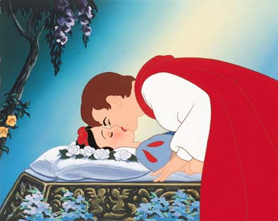 Os animais e pássaros do bosque, tendo reconhecido a rainha disfarçada, correm e voam até a mina para alertar os anões, que retornam correndo para ajudar Branca de Neve, porém chegam tarde demais. Imediatamente, eles se lançam numa perseguição à bruxa até o topo de uma montanha muito alta, onde, encurralada, ela escorrega e despenca pelo precipício, tendo seu merecido fim. Desolados com a morte de Branca de Neve, os anões concordam que a bela princesa não poderia jamais ser enterrada, e resolvem fazer um esquife de vidro. Durante vários dias os sete anões velam pela princesa, não sabendo que na verdade ela não estava morta, estava apenas presa a um sono eterno que só seria quebrado com o primeiro beijo de amor. O belo príncipe, que já conhecia Branca de Neve e havia se apaixonado por ela, descobre que uma jovem havia morrido e estava sendo velada num esquife de vidro e resolve ver se a moça é a sua amada. O príncipe ao ver a bela princesa, deitada em seu sono da morte, a beija. Os olhos da princesa se abrem como se acabasse de despertar de um sono profundo. Ambos se abraçam e o príncipe em seu cavalo branco se despede dos anões com Branca de Neve e juntos partem rumo ao castelo do príncipe, onde viveram felizes para sempre.